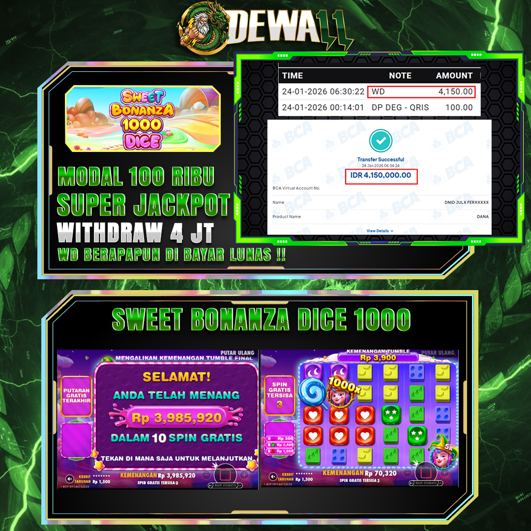 DEWA11 menghadirkan game jackpot vip yang di lengkapi fitur khusus new member hanya dengan modal deposit 100k dijamin akan withdraw 4,1+ juta malam ini.